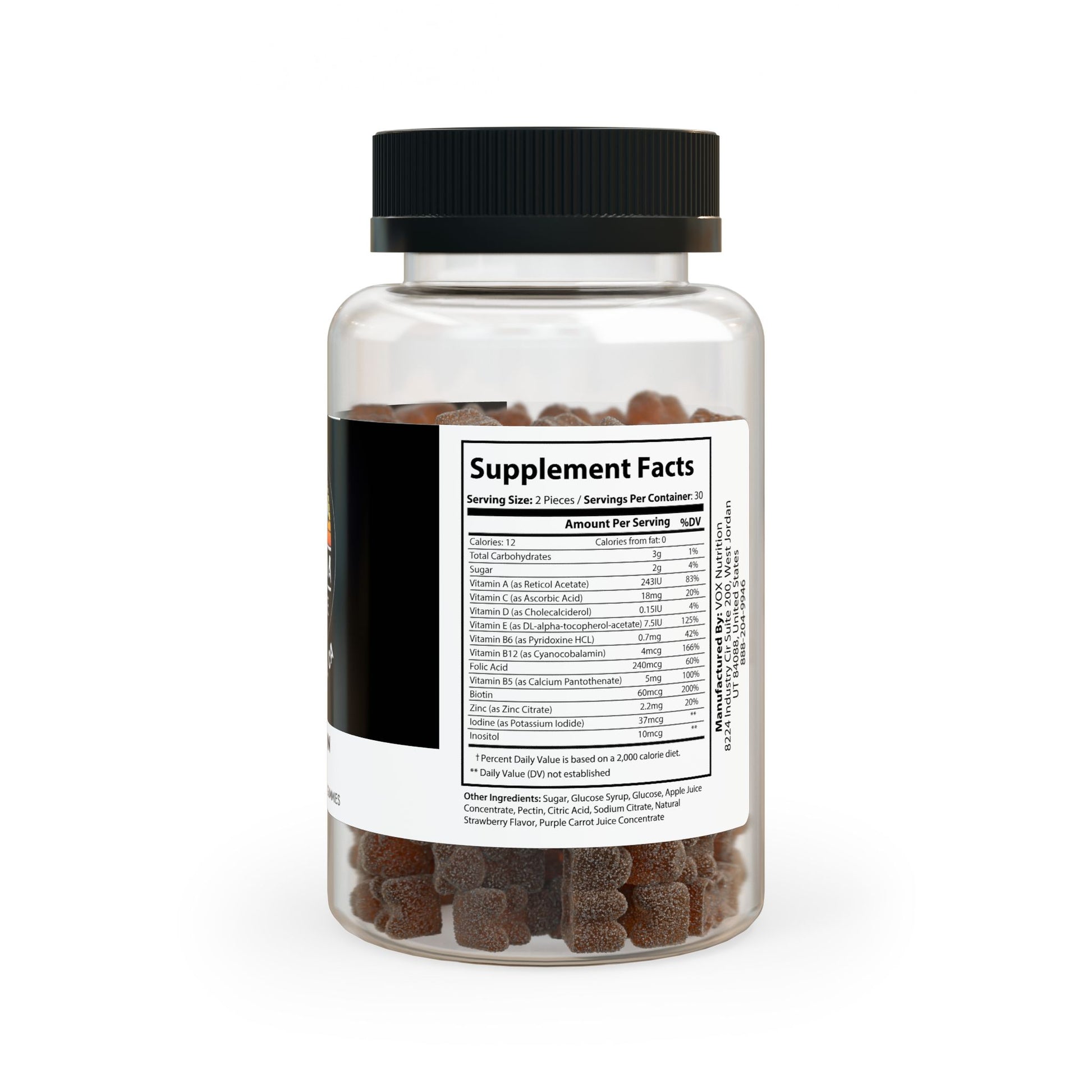 Ingredients: Vitamin A (as Reticol Acetate), Vitamin C (as Ascorbic Acid), Vitamin D (as Cholecalciderol), Vitamin E (as DL-alpha-tocopherol-acetate), Vitamin B6 (as Pyridoxine HCL), Vitamin B12 (as Cyanocobalamin), Folic Acid, Vitamin B5 (as Calcium Pantothenate), Biotin, Zinc (as Zinc Citrate), Iodine (as Potassium Iodide), Inositol. Other Ingredients: Sugar, Glucose Syrup, Glucose, Apple Juice Concentrate, Pectin, Citric Acid, Sodium Citrate, Natural Strawberry Flavor, Purple Carrot Juice Concentrate
